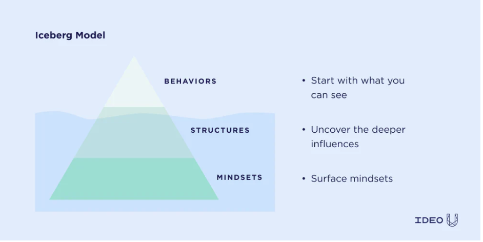 A particularly interesting concept in design thinking is the Iceberg Model. Often, problems persist because we focus only on visible symptoms, not underlying causes. The Iceberg Model helps us look beneath the surface to uncover patterns, structures, and mindsets that drive a system.